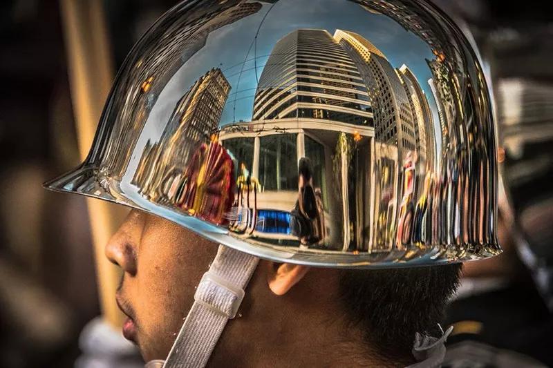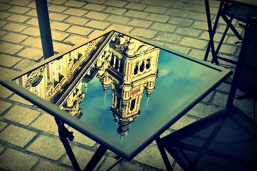 當(dāng)你使用帶邊框的反射面(如鏡子、光滑桌面、眼鏡)或體積很有限的反射面(如小水坑)時(shí),會(huì)形成類似框架式構(gòu)圖的效果,讓反射倒影部分變得頗為“吸睛”。
