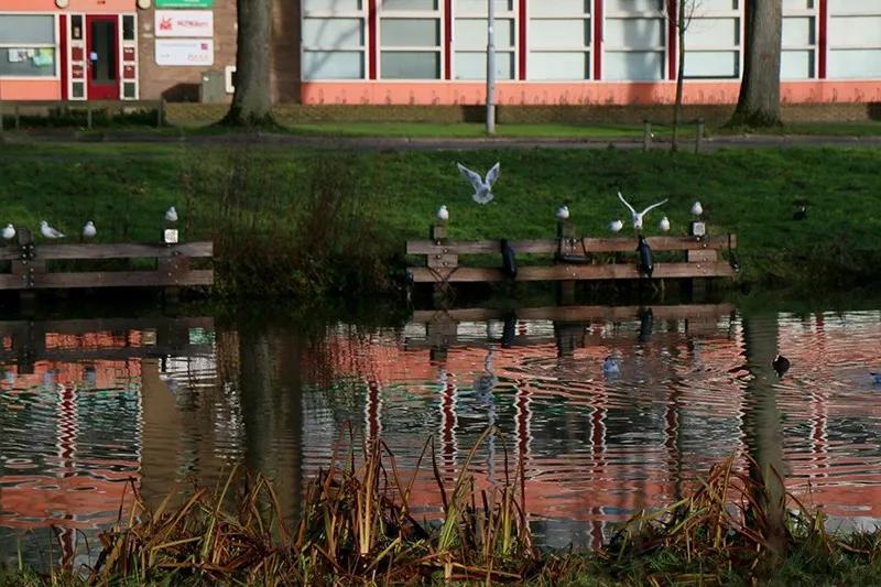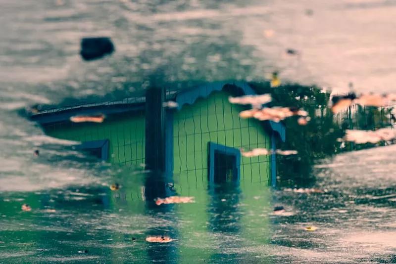 不平靜的水面會(huì)產(chǎn)生波紋,導(dǎo)致倒影的形狀發(fā)生變化。你可以利用這些產(chǎn)生變形的景物和實(shí)體進(jìn)行對(duì)比,比如說,水中扭曲的建筑物倒影: