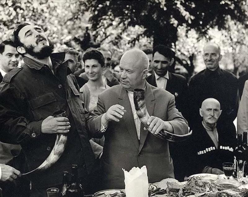 1962年古巴導(dǎo)彈危機(jī),翌年古巴領(lǐng)導(dǎo)人卡斯特羅訪(fǎng)問(wèn)蘇聯(lián),時(shí)任蘇聯(lián)領(lǐng)導(dǎo)人赫魯曉夫在格魯吉亞用獸角杯招待客人。