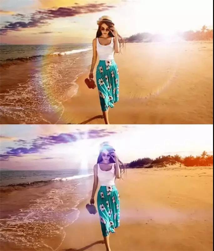 比如說,攝影師直接將太陽放入畫面中,那么就會看到人像頭部的眩光;如果不將太陽放入畫面中,就會看到周邊暖黃色的光暈;還有就是人像身上會有類似彩虹色的圓形光斑。
