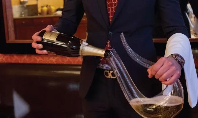 倒酒時(shí),需讓酒沿45°角的方向緩慢進(jìn)入醒酒器中。