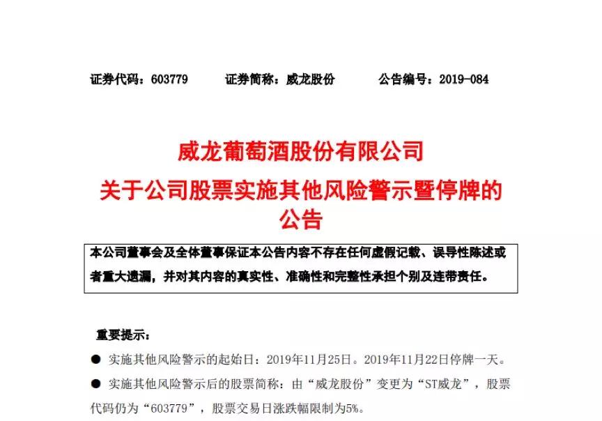 威龍股份發(fā)布公告稱,公司控股股東、實際控制人、董事長王珍海擅自以上市公司名義對外提供擔(dān)保,公司股票實施其他風(fēng)險警示,2019年11月22日停牌一天。股票簡稱由“威龍股份”變更為“ST威龍”,股票代碼仍為“603779”,股票交易日漲跌幅也從10%限制為5%。