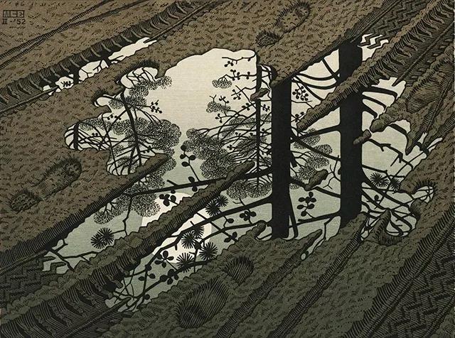 這張作品描繪的場景看似平淡無奇:車轍、鞋印、水坑,但倒映出來的卻是一個完全超自然的世界。日常景物與超現(xiàn)實倒影景物相互呼應,極富內(nèi)涵。