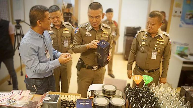 今年11月,有“假酒之王”稱號的63歲馬來西亞男子Chan Fat Yat在曼谷一停車場與客戶交貨時被捕。警方在現(xiàn)場繳獲了大量假冒洋酒、制假工具以及包裝盒,其中包括26瓶假冒尊尼獲加威士忌、100個尊尼獲加威士忌空瓶、252個偽造海關(guān)印章、以及眾多品牌烈酒與葡萄酒(尊尼獲加、芝華士、奔富Bin 389等)的酒標等。