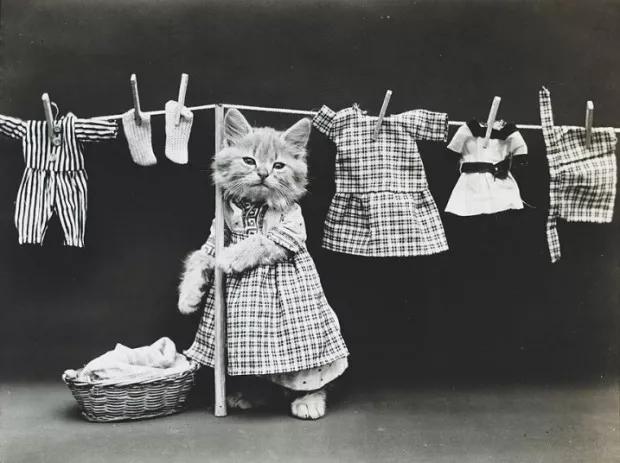 請大家放心,據當時媒體報道,貓咪穿的衣服都是弗里斯母親縫制的,外表看起來是普通的衣服,內部其實是和背景布相連的小口袋。還有一些小道具可以將貓咪的動作固定。