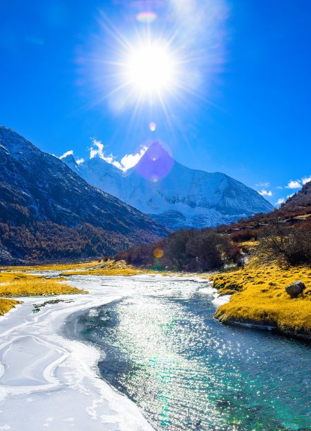 央邁勇雪山是稻城景區(qū)中著名的三座神山之一,它的海拔最高,終年積雪不化。草甸盡頭一座雪山拔地而起,直刺藍(lán)天。