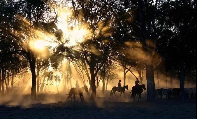 在逆光的樹林里面,牛,馬,羊,就是一個點