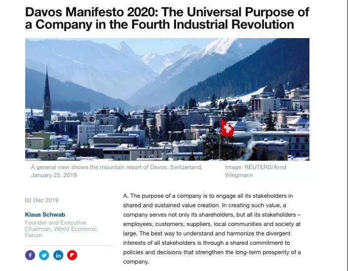 剛剛發(fā)布的2020年《達沃斯宣言》寫道:企業(yè)不僅要為股東,也要為所有利益相關(guān)者(員工、客戶、供應(yīng)商、當?shù)厣鐓^(qū)和整個社會)服務(wù)。在細則中,“為客戶服務(wù)”是第一條,“為股東提供投資回報”則被放在最后一條。