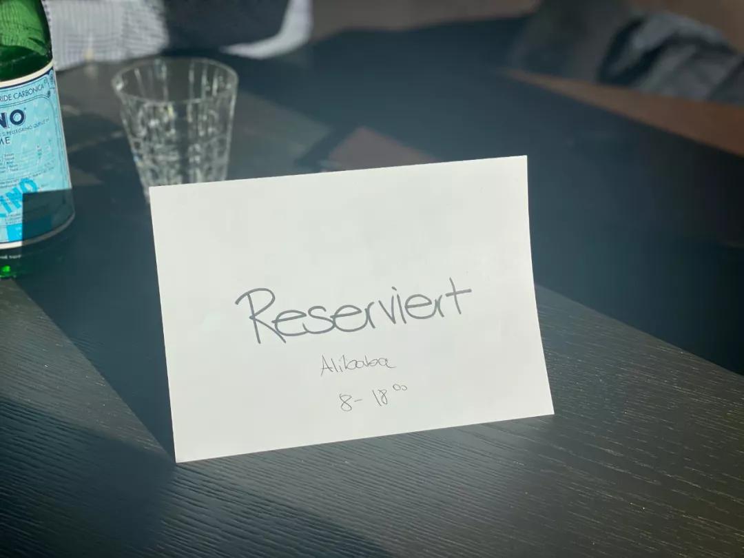 這是達沃斯小鎮(zhèn)離雪景名勝魔環(huán)山不遠處一個餐廳里,一張小咖啡桌上貼著預定的標簽。