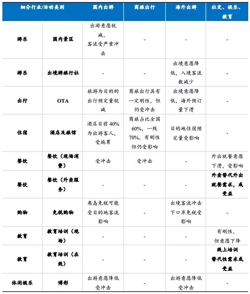這是因?yàn)?,旅游行業(yè)中的幾乎所有細(xì)分領(lǐng)域均涉及人群聚集與社交。不同于其他危機(jī)事件僅對(duì)某具體細(xì)分影響,例如國(guó)際關(guān)系僅影響出入境客流,流行性傳染病窗口期對(duì)旅游行業(yè)會(huì)構(gòu)成全面沖擊。