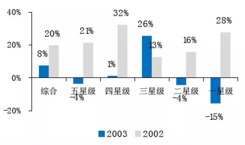 酒店住宿業(yè)當(dāng)年受到的沖擊非常明顯。2003年,全國(guó)星級(jí)飯店出租率同比下降4%,收入增速僅為8%,相比2002年的增速下滑12%。低星級(jí)收入受到的沖擊更明顯,其中一星級(jí)飯店收入增速下滑高達(dá)43%,二星級(jí)飯店收入增速亦有20%的放緩。