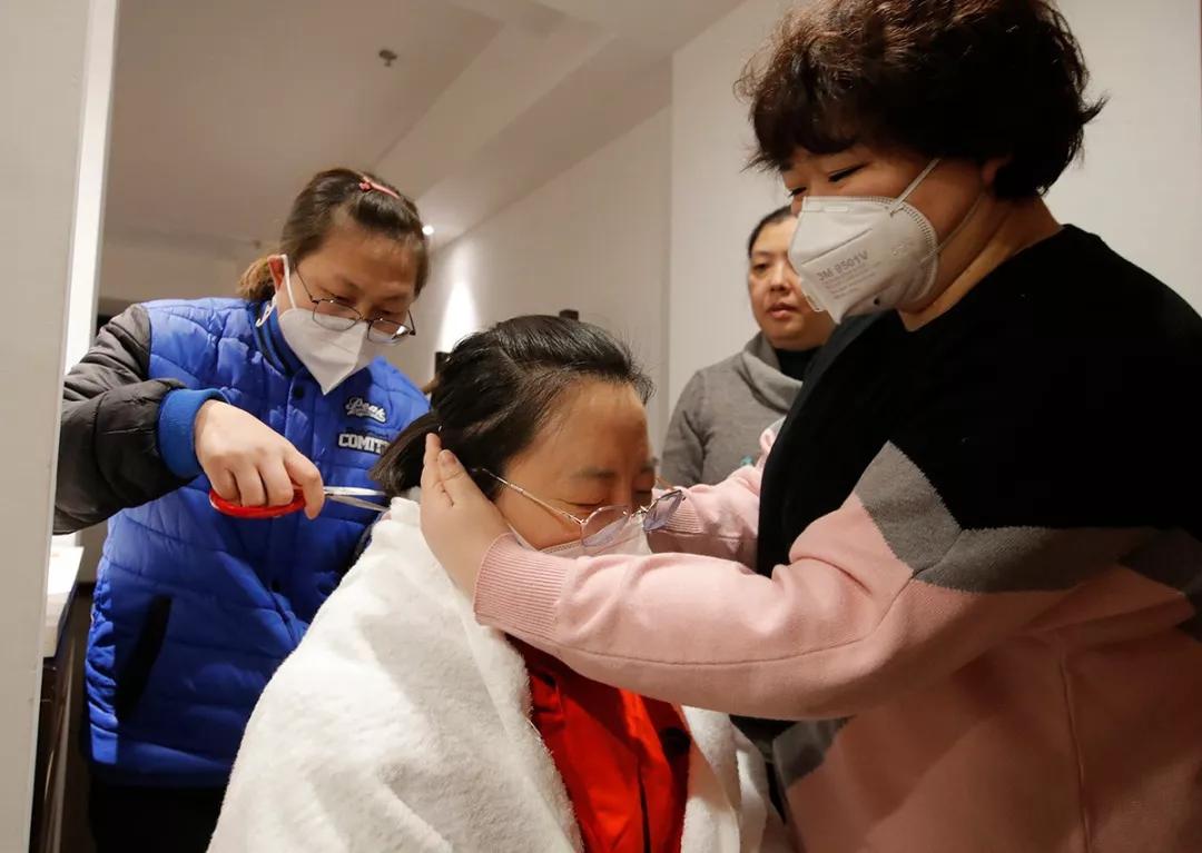 北京醫(yī)療隊(duì)到達(dá)后的第二天,由于就要穿著防護(hù)服進(jìn)行工作,宣武醫(yī)院的一位護(hù)士剪掉了自己的長發(fā)。