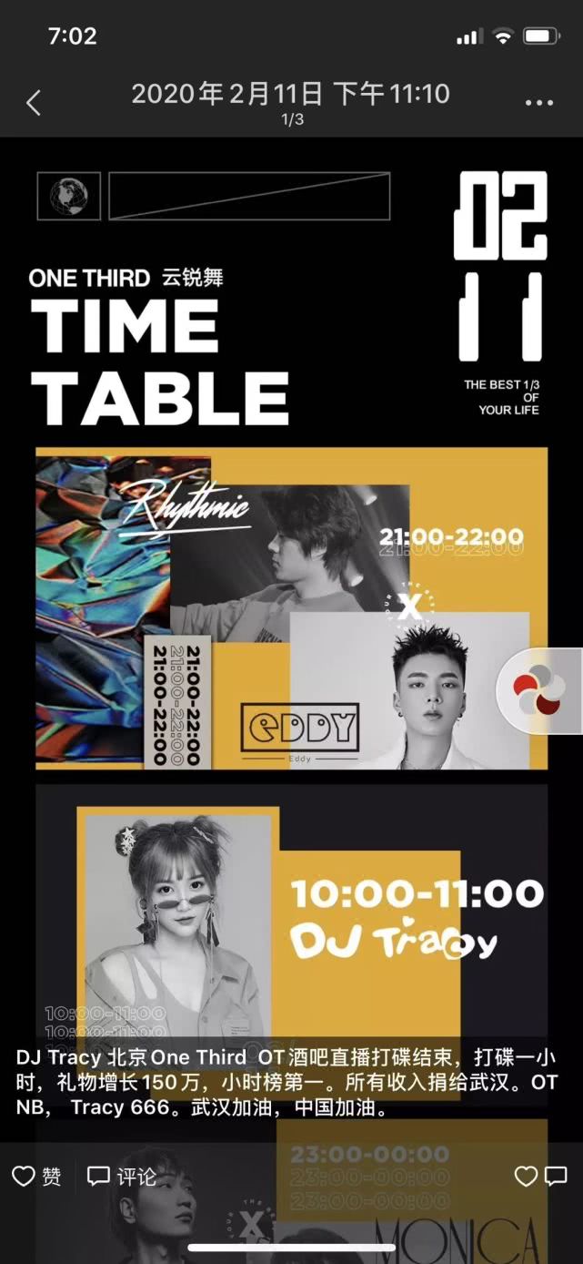 作為一家夜店的招牌之一,DJ們的日子也并不好過。2月11日,ONETHIRD在直播中邀請了嘉賓DJ Tracy。當(dāng)晚,Tracy創(chuàng)下了1小時收入150萬音浪的成績,價值約15萬人民幣,一同歸入了ONETHIRD的公益通道。