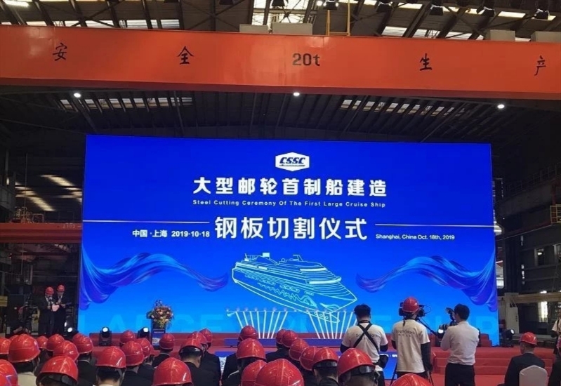 如果說效果圖是品牌還沒確定的產(chǎn)物,2019年10月18日上午10時(shí)40分左右,我國首艘國產(chǎn)大型郵輪在上海正式開工建設(shè),現(xiàn)場的圖片依然是這樣的: