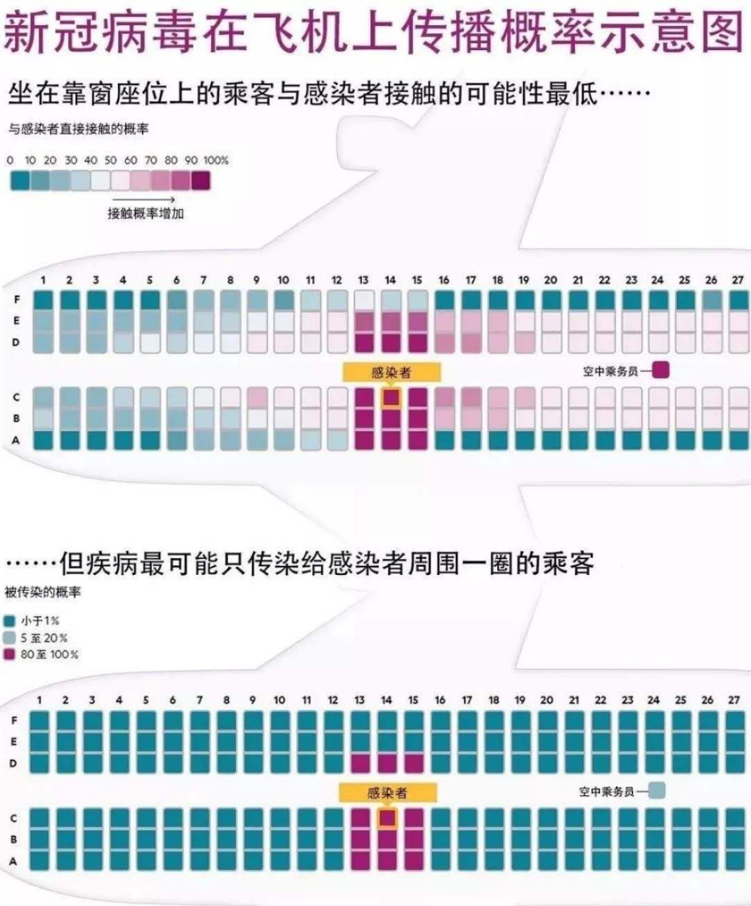 對(duì)于其他位置的乘客,危險(xiǎn)性并不顯著,這是由于客艙空氣在橫斷面上循環(huán),飛沫的播散被限制在少數(shù)幾排座位。