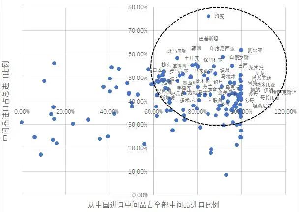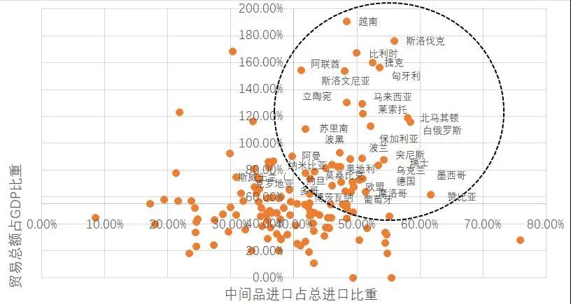 如圖所示,對國際貿(mào)易依賴程度更高、與國際供應(yīng)鏈聯(lián)系更強、且從中國進口中間品較多的國家大多都是發(fā)展中國家,幾乎沒有發(fā)達經(jīng)濟體。當(dāng)然,在部分產(chǎn)業(yè)中有些發(fā)達國家和中國在生產(chǎn)和消費環(huán)節(jié)的聯(lián)系非常緊密,如電子產(chǎn)業(yè)中以中日韓為核心形成了東亞生產(chǎn)體系,汽車產(chǎn)業(yè)中德國對中國的終端需求依賴度較高。