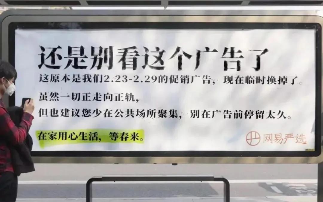 近日,在某中心商場(chǎng)附近的網(wǎng)易嚴(yán)選特殊戶外廣告“還是別看這個(gè)廣告了”刷屏。廣告牌上寫(xiě)著:“還是別看這個(gè)廣告了,這原本是我們2.23-2.29的促銷廣告,現(xiàn)在臨時(shí)換掉了。雖然一切正走向正軌,但也建議您少在公共場(chǎng)合聚集,別在廣告前停留太久。在家用心生活,等春來(lái)。”網(wǎng)易嚴(yán)選將廣告作為溫馨提醒,勸用戶不要看,不要聚眾,既展現(xiàn)了創(chuàng)意又傳遞了溫度。