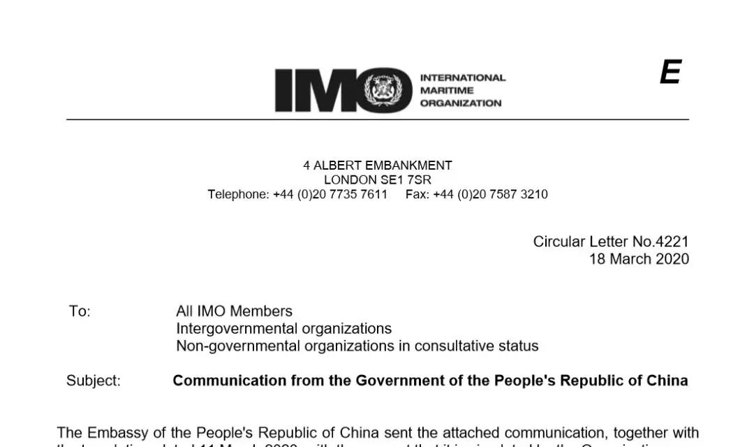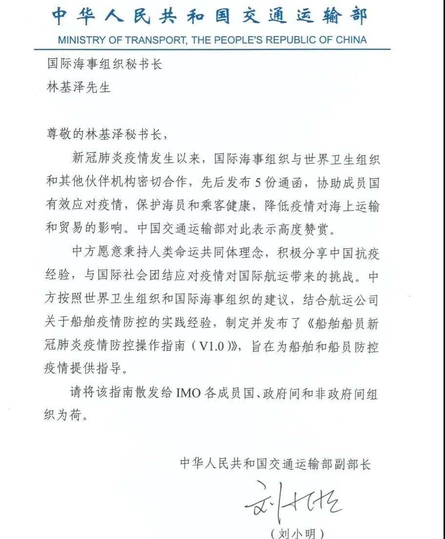 2020年3月18日,國際海事組織IMO發(fā)布Circular Letter No.4221,該通函件轉(zhuǎn)發(fā)了IMO秘書長林基澤先生收到的中華人民共和國交通運輸部劉小明副部長3月11日發(fā)送的信函,信函后附《船舶船員新冠肺炎疫情防控操作指南(V1.0)》。IMO正式向174個成員國推薦由中國海事局編制的《船舶船員新冠肺炎疫情防控操作指南》,《指南》結(jié)合廣東海事局和航運公司關(guān)于船舶疫情防控的實踐經(jīng)驗制定,包括了船舶落實防控實施,加強船員個人防護等6個方面。