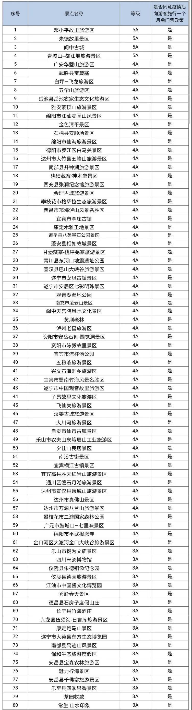 4月1日,四川省旅游景區(qū)協(xié)會(huì)公布,全省112個(gè)景區(qū)在4月對(duì)所有游客免門票!實(shí)行免費(fèi)景區(qū)名單如下: