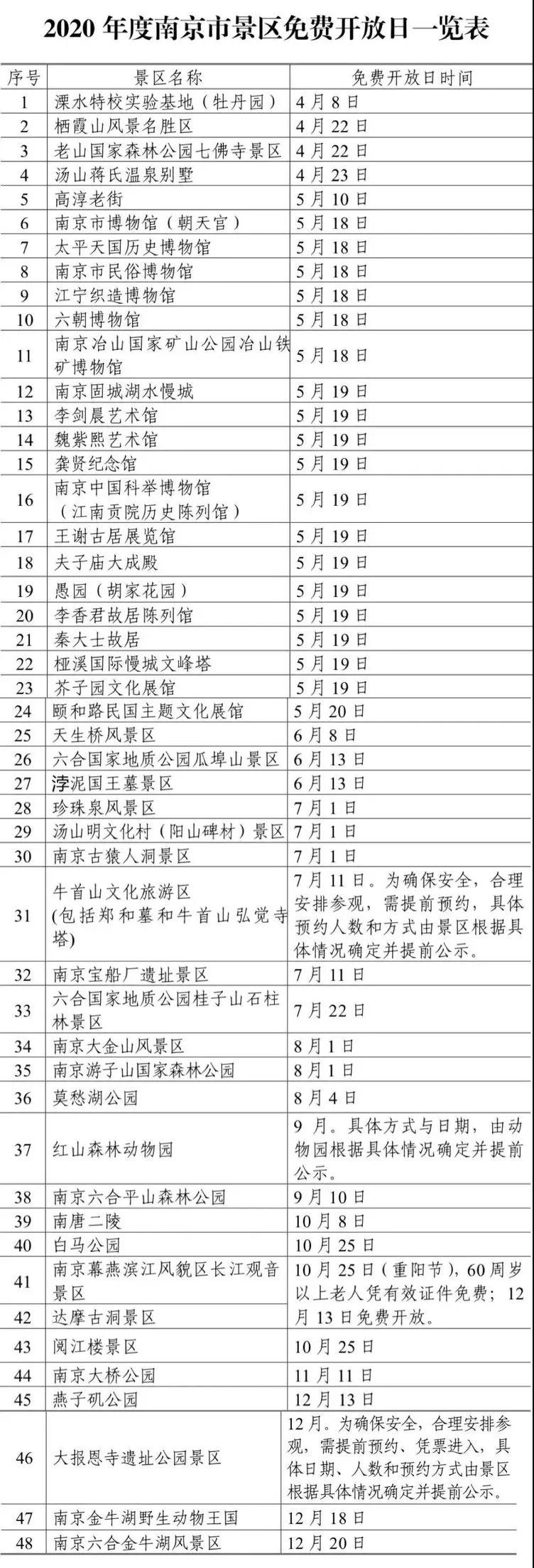 今年,南京共有48家旅游景點(diǎn)限時(shí)免費(fèi)開放,包括棲霞山、朝天宮、六朝博物館、南京中國(guó)科舉博物館、胡家花園……實(shí)行免費(fèi)景區(qū)名單如下:
