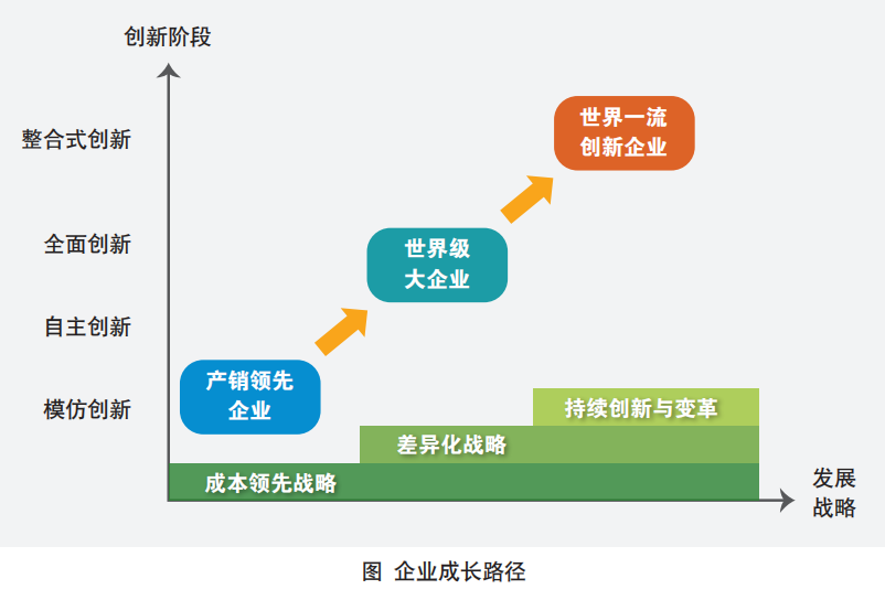 戰(zhàn)略選擇對于企業(yè)未來可以走到的位置有著決定性作用,企業(yè)不同成長階段分別對應(yīng)不同的發(fā)展戰(zhàn)略。成本領(lǐng)先戰(zhàn)略和差異化戰(zhàn)略只能幫助企業(yè)成為大企業(yè),唯有不斷創(chuàng)新才能幫助企業(yè)成為世界一流創(chuàng)新企業(yè)。