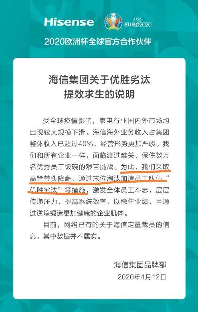 聲明稱:“受全球疫情影響,家電行業(yè)國內(nèi)外市場均出現(xiàn)較大規(guī)模下滑。海信海外業(yè)務(wù)收入占集團整體收入已超過40%,經(jīng)營形勢更加嚴(yán)峻。