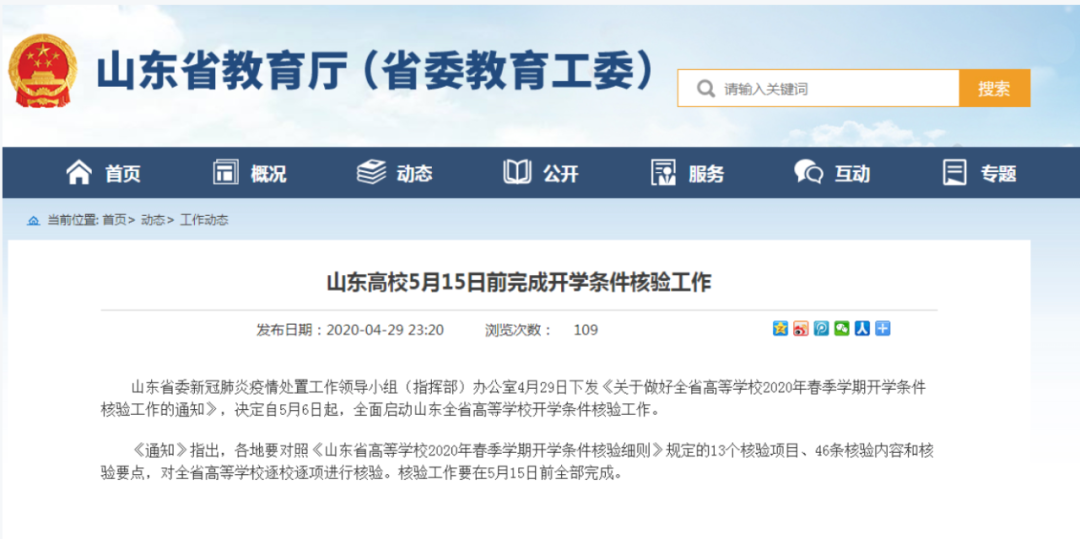 據(jù)山東省教育廳4月29日消息,山東省委新冠肺炎疫情處置工作領(lǐng)導(dǎo)小組(指揮部)辦公室4月29日下發(fā)《關(guān)于做好全省高等學(xué)校2020年春季學(xué)期開(kāi)學(xué)條件核驗(yàn)工作的通知》,決定自5月6日起,全面啟動(dòng)山東全省高等學(xué)校開(kāi)學(xué)條件核驗(yàn)工作。