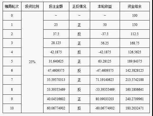 計(jì)算后每次下注比例為當(dāng)時(shí)總資金的25%,這樣就能獲得最大收益。