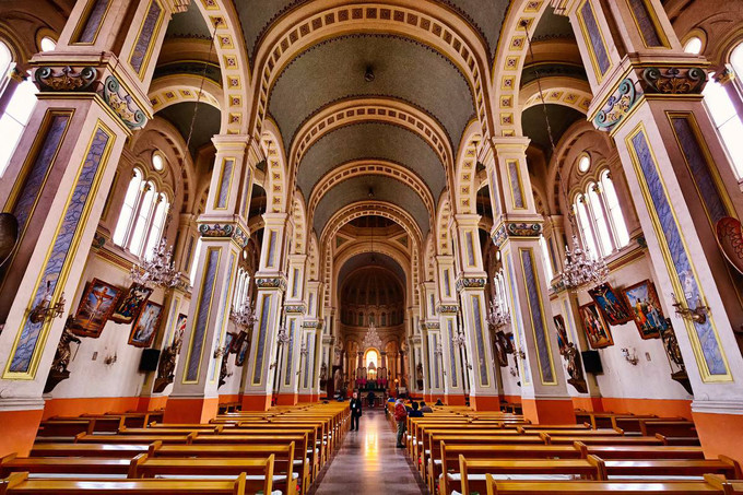 教堂外部用紅黃相間花磚砌成,三座呈品字形排列、高聳入云的塔樓上浮蓋著綠色銅片,塔樓頂上各有一個青銅十字架。走進教堂,映入眼簾的首先是湖藍、白色、淡黃構成的內(nèi)部主色調(diào),給人一種清新的感覺,14根立柱從門口排列到祭臺。教堂四周列著一座座精美的教徒銅像,墻壁上則掛著一幅幅記述耶穌受難故事的油畫,教堂內(nèi)還有圣母、耶穌、天使等的彩色塑像。