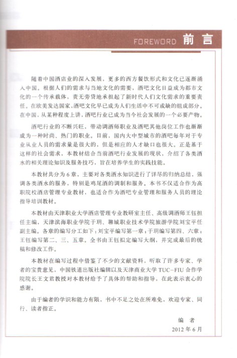 【網(wǎng)宣部】“全國優(yōu)秀導(dǎo)游員”/國家級“高級調(diào)酒師”劉寶平繼參編教材《旅行社經(jīng)營管理》出版后,副主編教材《酒水知識與服務(wù)技巧》于2012年10月出版,本教材結(jié)合當(dāng)前酒吧行業(yè)發(fā)展的現(xiàn)狀,介紹了各類酒水的相關(guān)理論知識及服務(wù)技巧,旨在培養(yǎng)學(xué)生的實(shí)踐技能。教材共分為6章,(劉寶平編寫第一章),主要對各類酒水知識進(jìn)行了詳盡的歸納總結(jié),強(qiáng)調(diào)各類酒水的服務(wù),特別是雞尾酒的調(diào)制和服務(wù),本書不僅適合作為高職院校酒店管理專業(yè)教材,也適合作為酒吧專業(yè)管理和服務(wù)人員的理論指導(dǎo)培訓(xùn)教材。