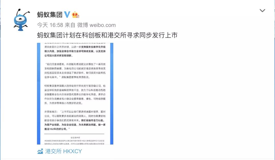 “我們很高興螞蟻集團今天宣布了將在香港和上海進行首次公開招股的計劃。