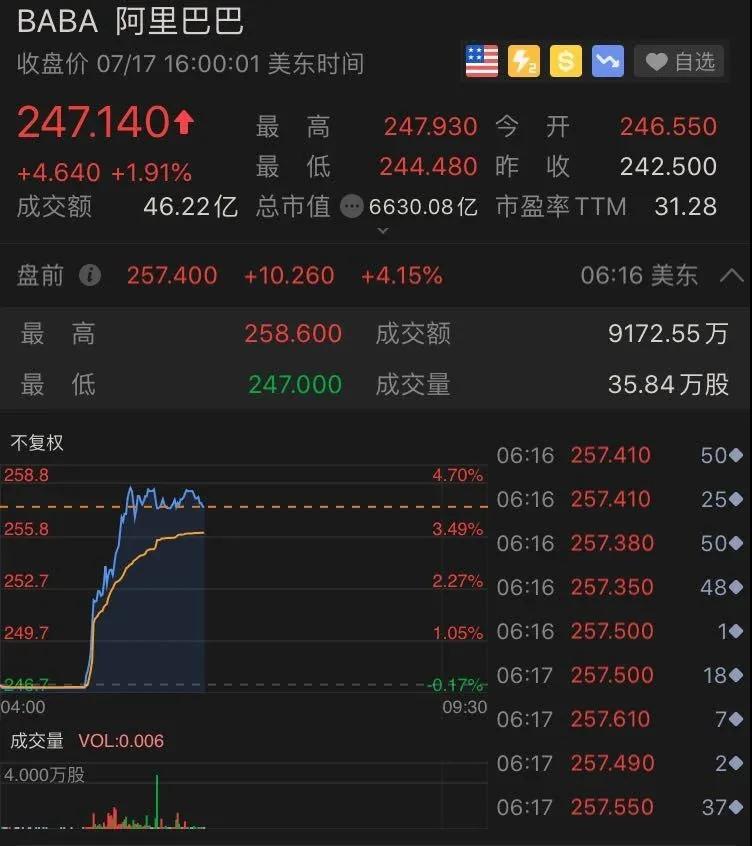 受此消息推動,阿里巴巴美股盤前迅速拉升,截至發(fā)稿,漲4.15%,報257.40美元。