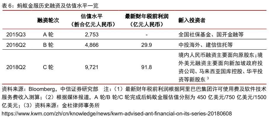 2015年、2016年、2018年,螞蟻集團分別完成A輪(約18.5億美元)、B輪(約45億美元)和C輪(約140億美元)融資。根據(jù)媒體報道,螞蟻金服在2018年6月完成C輪融資后的估值水平約為1500億美元,折合人民幣約萬億。