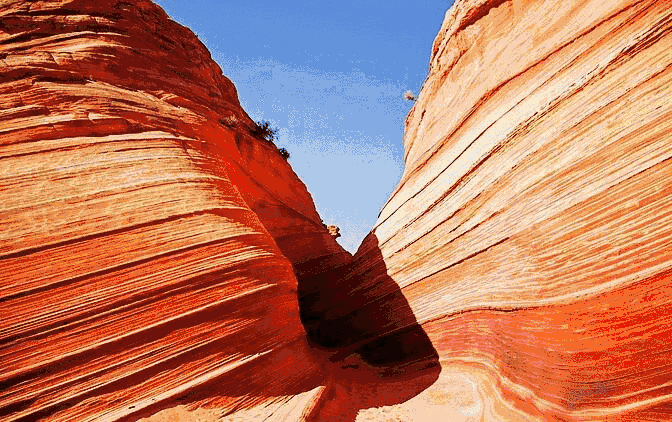 美西和陜北波浪谷,都是古老的沙丘隨著平原的上升,加上漫長的風(fēng)蝕,水蝕,峽谷里砂巖的層次逐漸清晰地呈現(xiàn)出來。平滑的,雕塑感的砂巖和巖石上流暢的紋路創(chuàng)造了一種令人目眩的三維立體效果。二者也有一定區(qū)別,美西波浪谷在紅色之間夾有白色線條,紅白相間;而陜北波浪谷則以紅色為主。