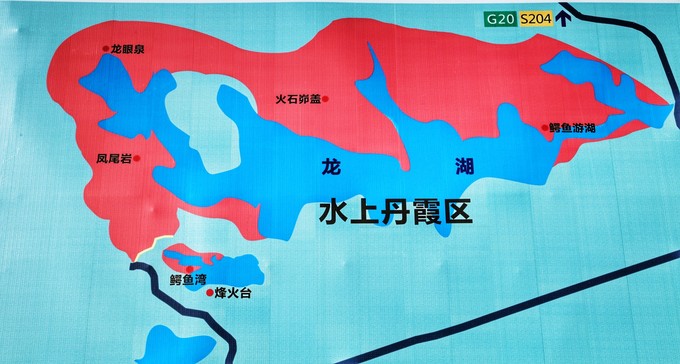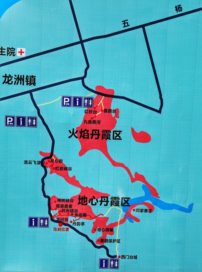 景區(qū)是很大一片區(qū)域,分為水上丹霞區(qū)、火焰丹霞區(qū)、地心丹霞區(qū)三個部分。路標指示不明確,只有“水上丹霞區(qū)”和“火焰丹霞區(qū)”兩個地方的標識,具體需要自行找路。根據(jù)當(dāng)?shù)厝私榻B,整個景區(qū)有1、2、3、4、5號五個景點,1至4號可以自行開車游覽,5號由于路況不好并且有十多公里路遠,需要花200元左右請當(dāng)?shù)厝藥凡拍芮巴聢D是現(xiàn)場拍的景區(qū)示意圖,能很清晰的看出景區(qū)分布,供大家參考。