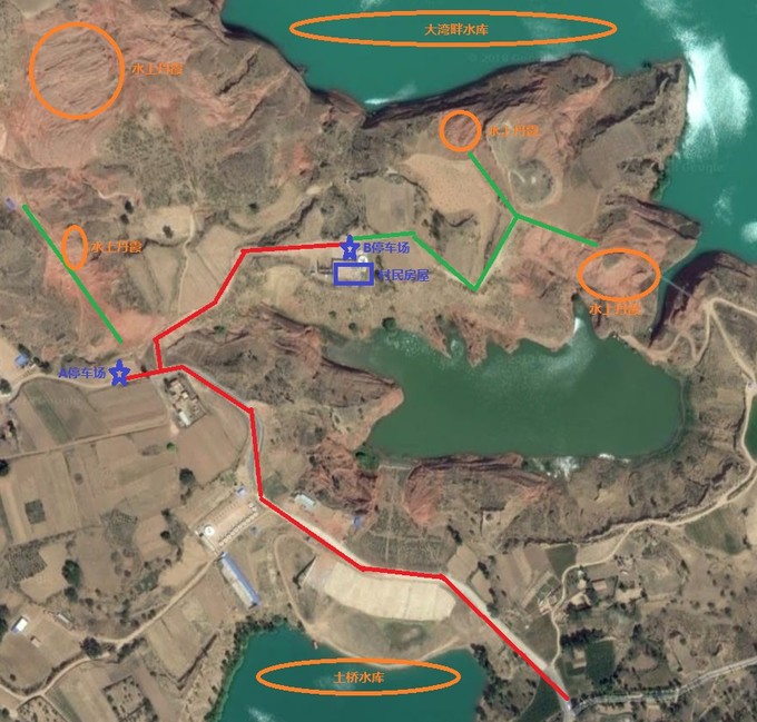 在龍州鎮(zhèn)北邊有幾處明顯的“水上丹霞”指示牌指向水上丹霞,過土橋水庫向前幾百米,A停車場就在路邊,停車前行就可以看見被圍欄圍起來的一片丹霞。B停車場設(shè)在當(dāng)?shù)匾粦艮r(nóng)民的院內(nèi),右手有一個農(nóng)民自己修建的岔路,進去一兩百米就是了。