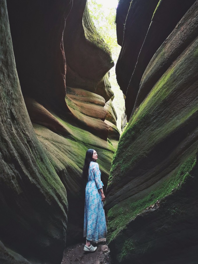 其中,沿著棧道走到最下面左轉(zhuǎn)的閆家寨附近的水面在修碼頭以后會有游船,右轉(zhuǎn)是所謂的一線天,到入口看了下里面很狹窄,加上雨季可能有落石不太安全就沒有進入。這部分的特點是在峽谷底部的行走,景色沒有水上丹霞好。