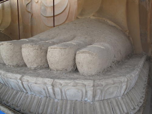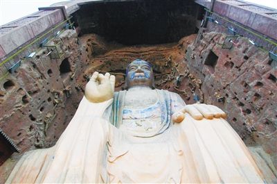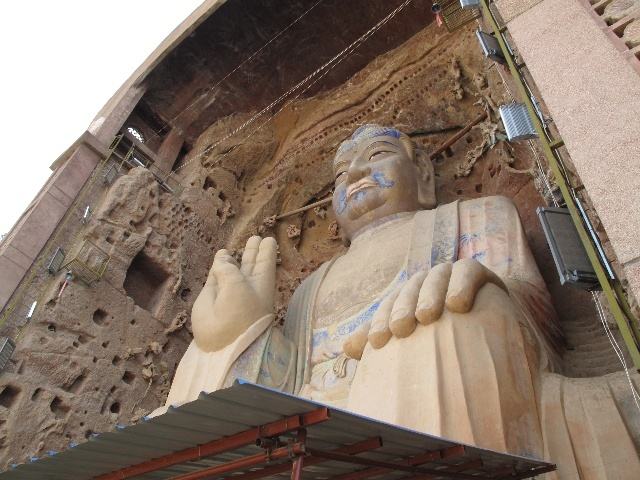 甘谷大佛石窟造象可遠(yuǎn)溯至北魏,具體年代已經(jīng)無從稽考?,F(xiàn)存釋迦牟尼大佛像始鑿于北魏,一直到盛唐才趨完美。大佛石胎泥塑,身高23.3米,腰闊10.4米,結(jié)跏跌坐于蓮座之上,高大魁梧,溫順善良,坐于30.2米高、窟頂呈圓拱形的石窟內(nèi),頤面豐滿,肉髻高突,兩耳下垂,頸短并飾三道弦紋,短須作蝌蚪狀,施拔濟(jì)眾生印,足踩豐蓮??邇?nèi)還殘存懸塑達(dá)摩、頻伽、飛天、卷云、蓮葉等,栩栩如生。