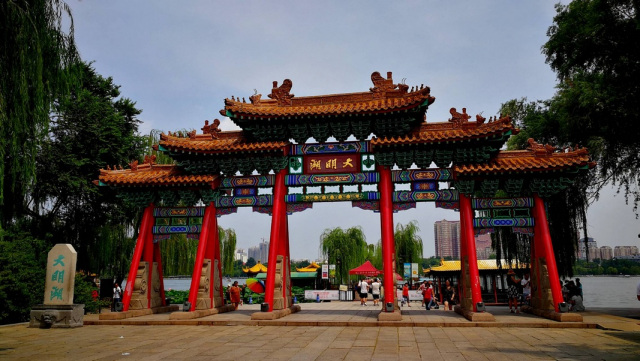 南門牌坊,大明湖南門,為一民族形式的牌坊。1952年由濟南府學文廟遷此。原為木結(jié)構(gòu),1984年改為混凝土木結(jié)構(gòu),樣式依舊。五間七彩重昂單檐,飾有吻獸。坊頂黃色琉璃瓦覆蓋,檐下云頭斗拱承托,額枋彩繪“旭日云鶴”、“金龍戲珠”、“西番蓮”等圖案。匾額上書“大明湖”三個鎏金大字。12根斜柱支撐著三階式錯落的坊頂,柱礎(chǔ)由石鼓夾抱。整個建筑金碧輝煌,宏偉壯觀,被視作大明湖的標志。牌坊西側(cè),立有清嘉慶十六年(1811年)《大明湖》石碑,為登州(今蓬萊)于書佃手筆。牌坊匾額“大明湖”三字,即依該碑字跡刻成。牌坊兩側(cè),門房對稱,歇山卷棚,上覆綠色琉璃筒瓦,顯得玲瓏典雅。房前架雕欄小石橋,橋下各有石砌小溪。珍珠、濯纓等清泉經(jīng)此溪注入大明湖。坊內(nèi)設(shè)碼頭,柳浪垂蔭,畫舫停泊,往來渡客。