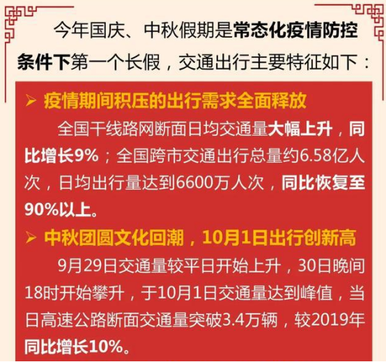 另外,9月30日,全國(guó)高速公路擁堵里程較往年上升159%,達(dá)到5336公里。10月1日,全國(guó)高速擁堵里程較歷史同期上升50.1%,高達(dá)9109公里。