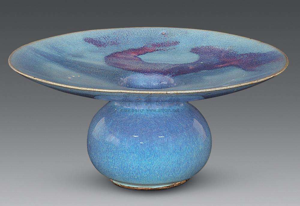 器物上單燭的紫斑幾乎不見,絕大部分是青藍(lán)釉和紅釉互相熔合的玫瑰紫色;