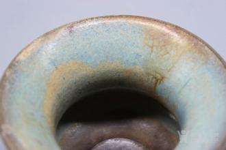 底部不再有芝麻釉,而施與器身相同的色釉,不見蚯蚓走泥紋,多有開片。燒造工藝采用大于圈足的墊餅墊燒,在板沿盤上采用三支釘支燒。由于支釘與器物粘連在一起,燒成后多是敲掉的,故支釘痕較大且高低不平。元代鈞窯的產(chǎn)量不斷增加,但質(zhì)量下降。個(gè)別精品中其工藝水平卻堪與宋鈞媲美,只是為數(shù)不多罷了。鈞瓷起于唐代,北宋達(dá)到了鼎盛,而金元時(shí)代仿鈞品生產(chǎn)已經(jīng)達(dá)到了宋鈞水平。多數(shù)胎質(zhì)明顯粗松,胎壁較厚,外壁施釉往往不到底,胎釉交接邊沿不整齊,釉面有琮眼氣泡,以天藍(lán)月白等色為多見。藍(lán)釉紅斑的斑塊邊界線清晰,與金代暈散的斑塊有明顯差別。并流行大型器。碗、盤類底足足端修削呈斜面,底中心凸起,除以釉色取勝外,常有貼花裝飾。鈞窯的胎、釉屬于瓷胎,大多以灰色胎為主,灰中又分淺、深二種,另外又有灰白色、淡黃色,前者(灰色胎)精細(xì)固密,叩之呈金屬聲,此為早期產(chǎn)品。灰白色和淡黃色胎質(zhì)較粗松,叩聽其聲近乎瓦,此類多屬晚期產(chǎn)品。鈞瓷有兩種釉,暗釉和亮釉。亮釉鈞器釉質(zhì)較粗糙,釉層薄,開大小紋片,且釉上多棕眼,內(nèi)多魚子紋,外部著釉多不到足腳,圈部中心刷圈釉或根本無釉。南宋后至元代,此種鈞器較多見。宋鈞"窯變"特征是出于釉藥中活動(dòng)性配方,且與窯爐結(jié)構(gòu)關(guān)系密切,又有影響鈞瓷成品率的,則是所用燃料,窯裝之稀密,外在因素的寒暑、晴雨、風(fēng)向、均要窯工們能有應(yīng)變配合能力。否則,即可出現(xiàn)古人所講的十窯九不成的結(jié)局