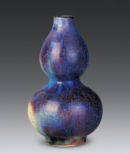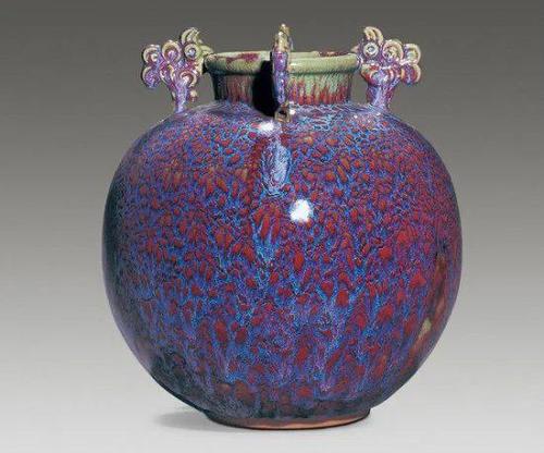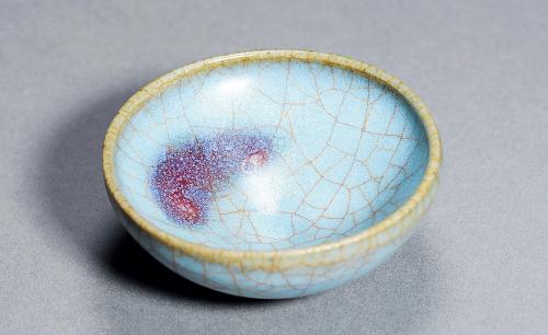 鈞釉的紅色是由于還原銅的呈色作用。紅釉中含有0.1~0.3%的CuO(氧化銅),還含有一定數(shù)量的 SnO2(二氧化錫)。在天藍(lán)、天青和月白色釉中,CuO含量極低,只有0.001~0.002%,和一般白釉中的含量相近,鈞釉的紫色是由于紅釉與藍(lán)釉互相熔合的結(jié)果,鈞瓷的紫斑是由于在青藍(lán)色的釉上有意涂上一層銅紅釉所造成的。