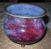 鈞瓷釉采用氧化銅為著色劑,在還原氣氛中燒成銅紅釉。這樣,燒出的釉色青中帶紅、如藍(lán)天中的晚霞。鈞窯釉色大體上分藍(lán)、紅兩類、具體的可呈現(xiàn)月白、天青、天藍(lán)、蔥翠青、玫瑰紫、海棠紅、胭脂紅、茄色紫、丁香紫、火焰紅等。其中,藍(lán)色也不同于一般的青瓷,是各種濃淡不一的藍(lán)色乳光釉。藍(lán)色較淡的稱天青,較深的稱為天藍(lán),比天青更淡的稱為月白,都具有瑩光一般幽雅的藍(lán)色光澤。