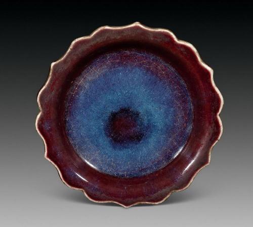 明張應(yīng)文撰《清秘藏》“均州窯,紅若臙脂者為最,青若蔥翠色、紫若墨色者次之。色純而底有一二數(shù)目字號(hào)者佳,其雜色者無足取,均之釉無論深淺濃淡皆混然一律,元瓷之釉濃處有時(shí)或起條文,淺處有時(shí)仍見水浪”