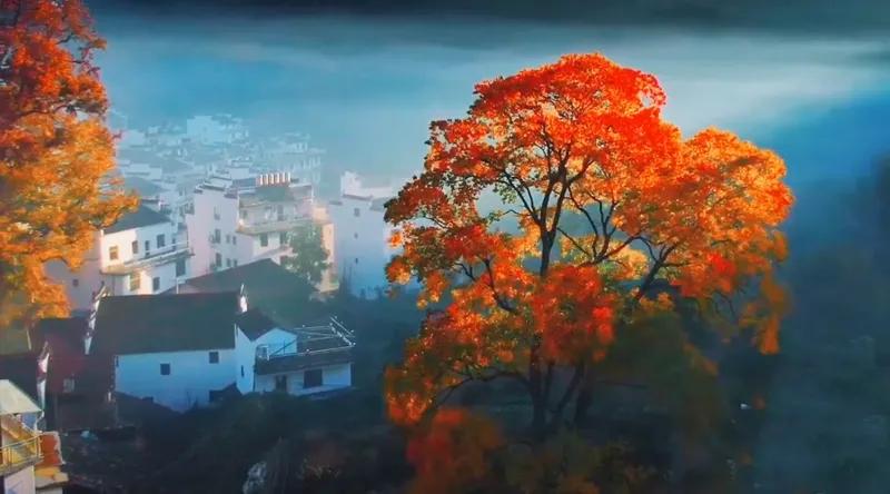 婺源的紅秋天,美哭了全世界。清晨,云霧彌漫,炊煙裊裊,在空中肆意流動變幻著各種形態(tài),如一幅未干的水粉畫。