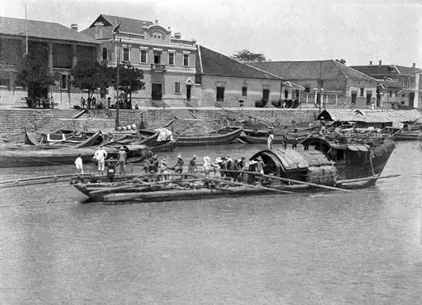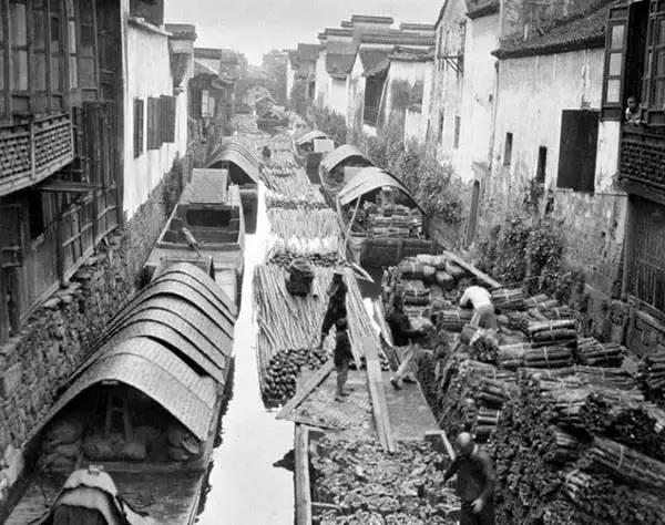 杭州,大運(yùn)河里裝載木材的船只