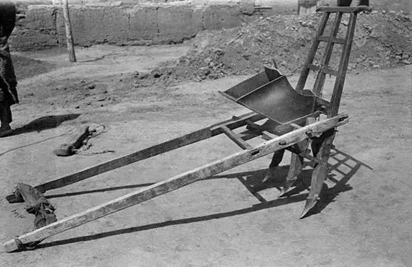 簍。由牲畜牽引,后面有人把扶,用來(lái)完成開(kāi)溝和播種兩項(xiàng)工作,這種農(nóng)具在東北使用比較普遍,它也是現(xiàn)代播種機(jī)的前身