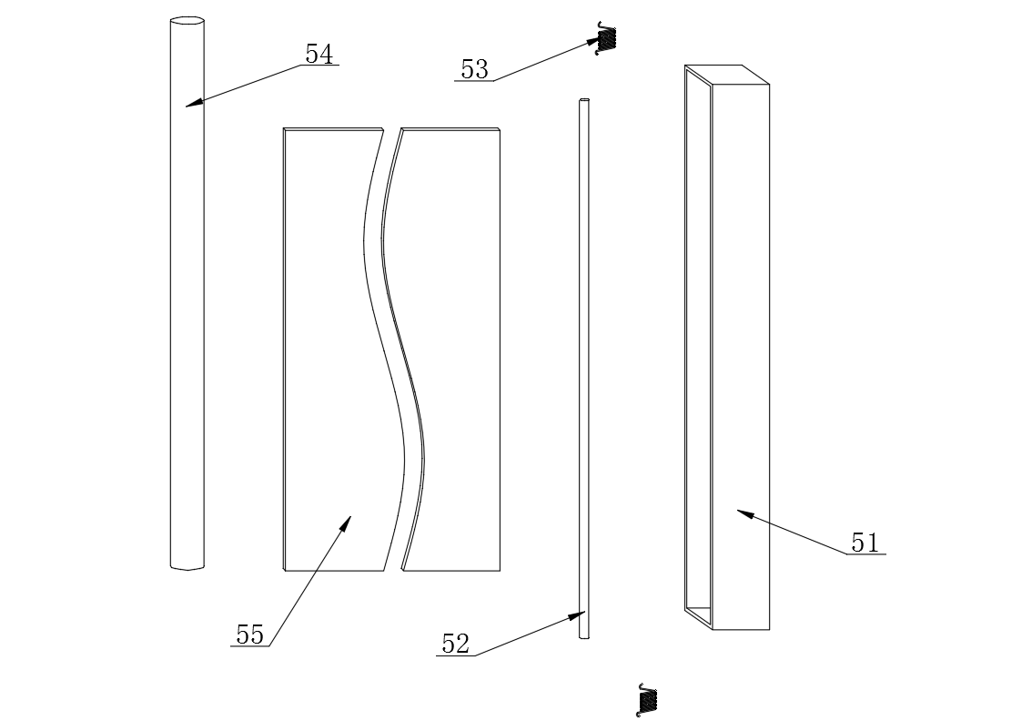 所述拓展展示件5包括收聚盒51,所述收聚盒51內(nèi)部設(shè)有主體桿52,所述主體桿52兩端均與收聚盒51內(nèi)壁之間轉(zhuǎn)動(dòng)連接,所述主體桿52兩端與收聚盒51內(nèi)壁之間設(shè)有轉(zhuǎn)向扭簧53,所述轉(zhuǎn)向扭簧53兩端分別主體桿52和收聚盒51內(nèi)壁固定連接,所述主體桿52一側(cè)設(shè)有手持桿54,所述手持桿54與主體桿52之間設(shè)有拓展卷55,所述拓展卷55兩端分別與手持桿54和主體桿52固定連接;