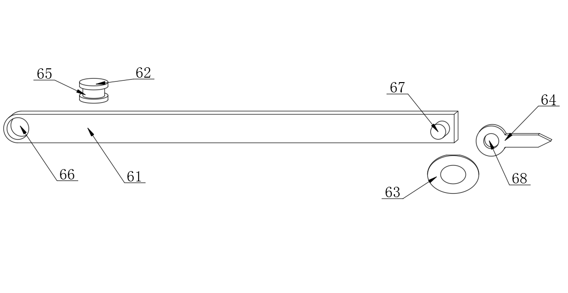 所述指向件6包括連接桿61,所述連接桿61一端設(shè)有定位柱62,所述連接桿61另一端設(shè)有固定吸盤(pán)63,所述固定吸盤(pán)63與連接桿61之間設(shè)有指示標(biāo)64,所述定位柱62中部開(kāi)設(shè)有轉(zhuǎn)向槽65,所述連接桿61與定位柱62連接處設(shè)有第一通孔66,所述連接桿61另一端固定設(shè)有固定柱67,所述固定柱67遠(yuǎn)離連接桿61一端與固定吸盤(pán)63固定連接,所述指示標(biāo)64與固定柱67連接處開(kāi)設(shè)有第二通孔68。